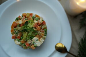 Склад: печені овочі: батат та морква, малосольний огірок, фета мигдалева, зелений горошок, майонез (власного виробництва) на основі аквафаби та сиродавленої гірчичної олії, гірчичний соус на основі кокосового йогурту.