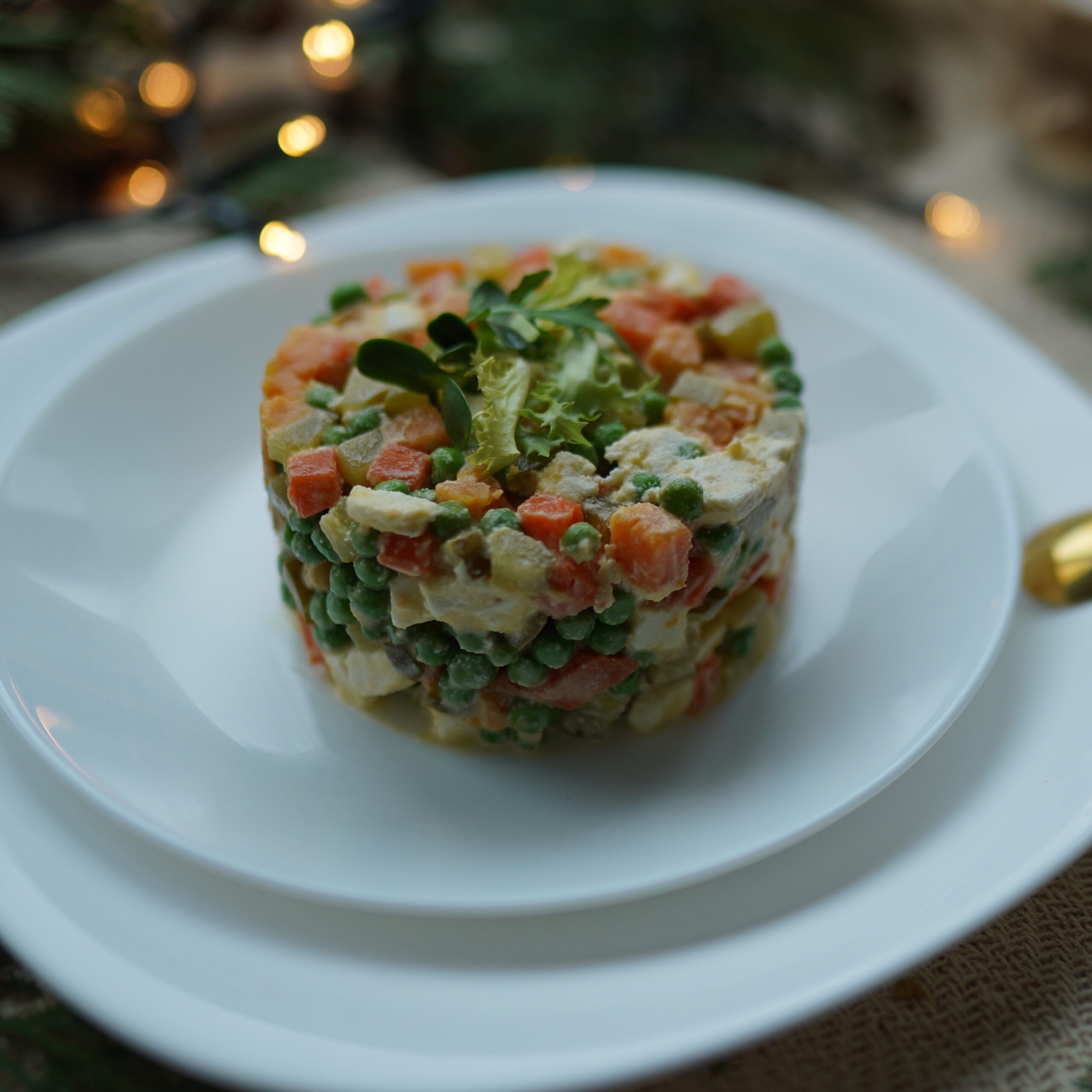 Склад: печені овочі: батат та морква, малосольний огірок, фета мигдалева, зелений горошок, майонез (власного виробництва) на основі аквафаби та сиродавленої гірчичної олії, гірчичний соус на основі кокосового йогурту.